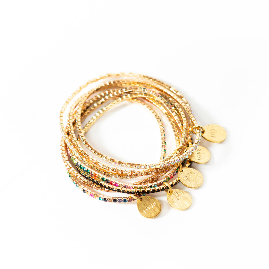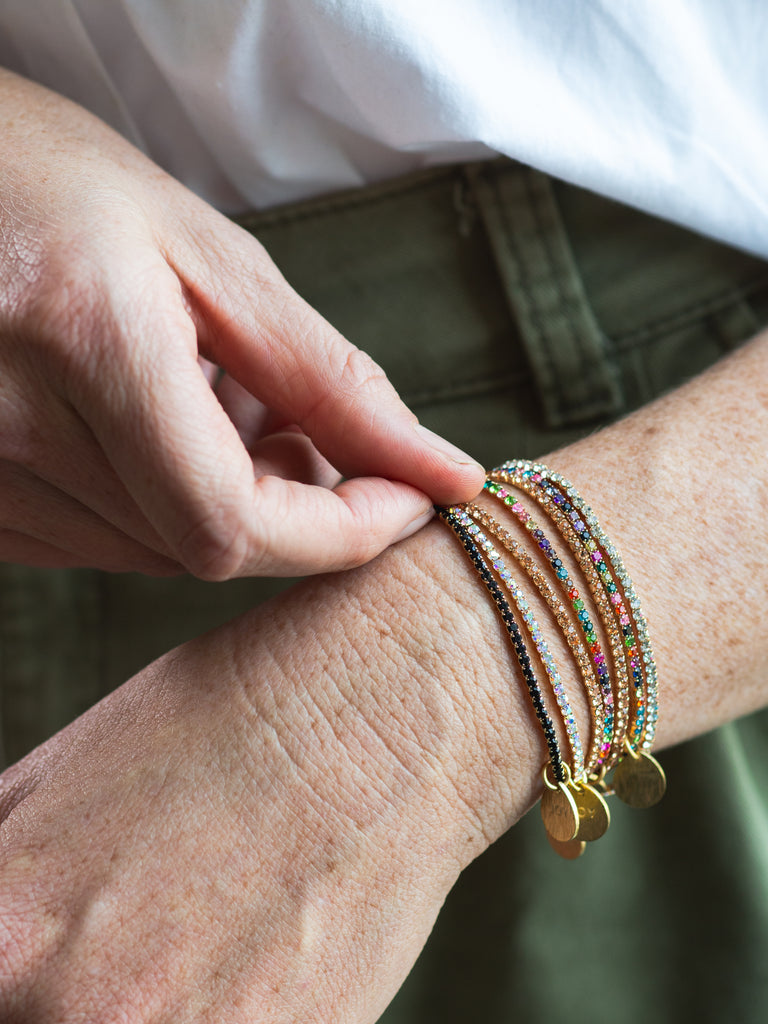 Beauty and bling come together in our Rhinestone Charm Bracelets - sure to glam up any look! Tiny rhinestones surround each bracelet, while a stamped charm adds a fun detail.  Up your arm candy game in just one piece!  THIS LISTING IS FOR 1 BRACELET.   Enjoy!