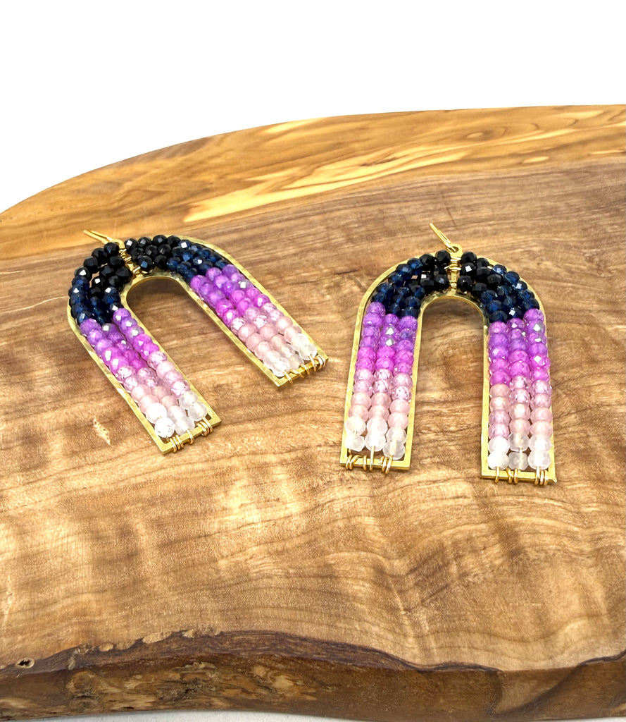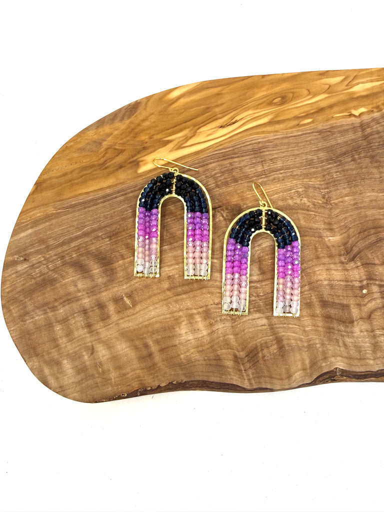 The Arc Earring - Dusk edition features a color-blocked quartz design inspired by a sunset. The arc shape is modern and lightweight making them easy to wear. Add these Arcs to your collection, you will love them. 💕